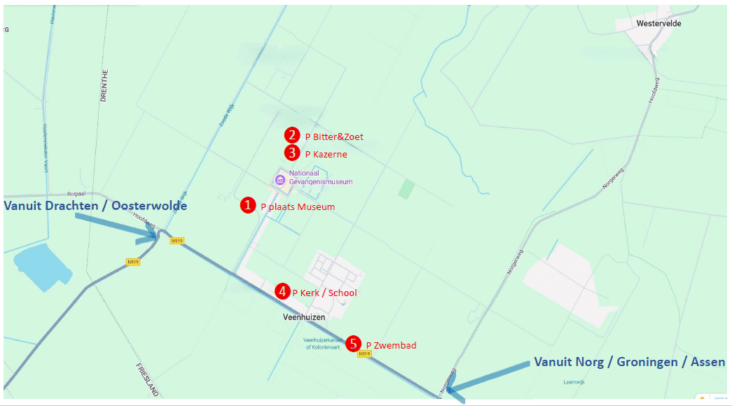 Parkeren is alleen toegestaan op de daarvoor aangewezen parkeerplaatsen, die vind u op het kaartje hieronder. Als u met de auto via de A28 komt denk er dan aan dat u niet via de afslag Assen-West naar Veenhuizen kunt rijden maar rijd via de aangegeven route met Google Maps.